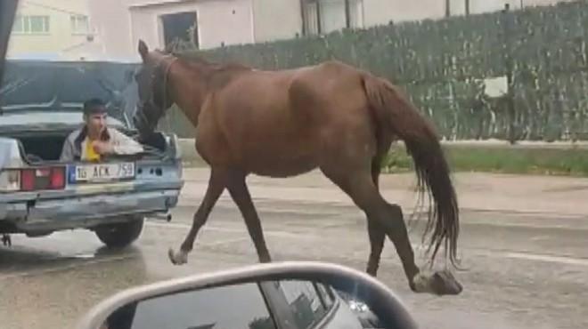 Bursa’nın merkez Osmangazi ilçesine bağlı 11 Eylül Bulvarı üzerinde bir otomobilin bagajında oturan çocuk, atı boynuna bağlı iple çekerek peşlerinden koşturdu.