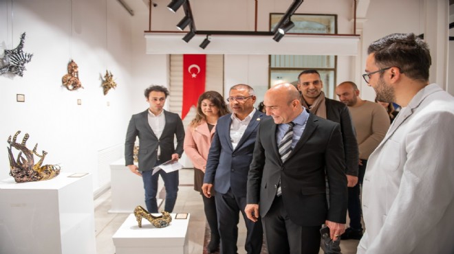Disiplinlerarası çalışmalarını sürdüren Fırat Karapınar ise özellikle spor ayakkabılardan kaynaklı ciddi bir atığın mevcut olduğunu dile getirerek şöyle konuştu; “Yılda 25 milyar spor ayakkabı üretiliyor ve bunlar geri dönüşüme dahil edilmiyor. Biz ayakkabılardan da farkındalık yaratabileceğimizi düşündük ve atılmış ayakkabıların parçalarından plastik nesnelerden, kumaş parçalarından, insanların yaşamlarına dokunmalarını sağlamaya çalıştık. Bu eserleri yaratırken Zygmunt Bauman’ın ‘Iskarta Hayatlar’ adlı kitaptan esinlendim. Renk olarak altın, gümüş ve bakır gibi sembolik renkler tercih ettim. Bunları seçmemin özel bir nedeni var; madeni değerler tüm dünya sınırlarını yeniden şekillendiriyor ve değerli kılıyor. İzmir’in kent kültürüne nitelikli mekanlar kazandırdığı ve genç sanatçılarla ilgilendiği için İzmir Büyükşehir Belediye Başkanı Tunç Soyer’e teşekkür ederim.”
