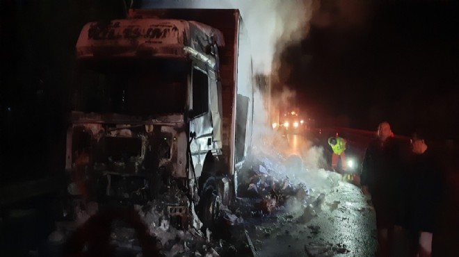 Aydın-İzmir Otoyolu'nda, kırtasiye ve giyim malzemesi taşıyan tırda çıkan yangında araç kullanılamaz hale geldi.