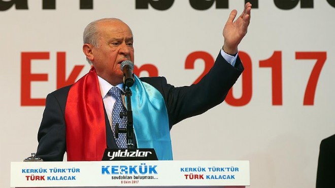 Irak anayasasına göre tartışmalı olan bölgelerde de sandık kurulduğunu anımsatan Bahçeli, "Kerkük oldubittiye getirilerek, dayatma ve tehditle kirli referanduma dahil edildi. Barzani'nin 25 Eylül komplosu Sevr'i canlandırma teşebbüsüdür. Bu komplo Türkiye ve komşu ülkeleri parçalama testidir." dedi.