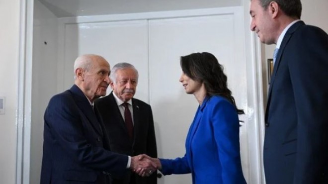 Görüşme başlangıcında Bahçeli ile DEM Parti eş genel başkanları Tülay Hatimoğulları ve Tuncer Bakırhan tokalaştı.