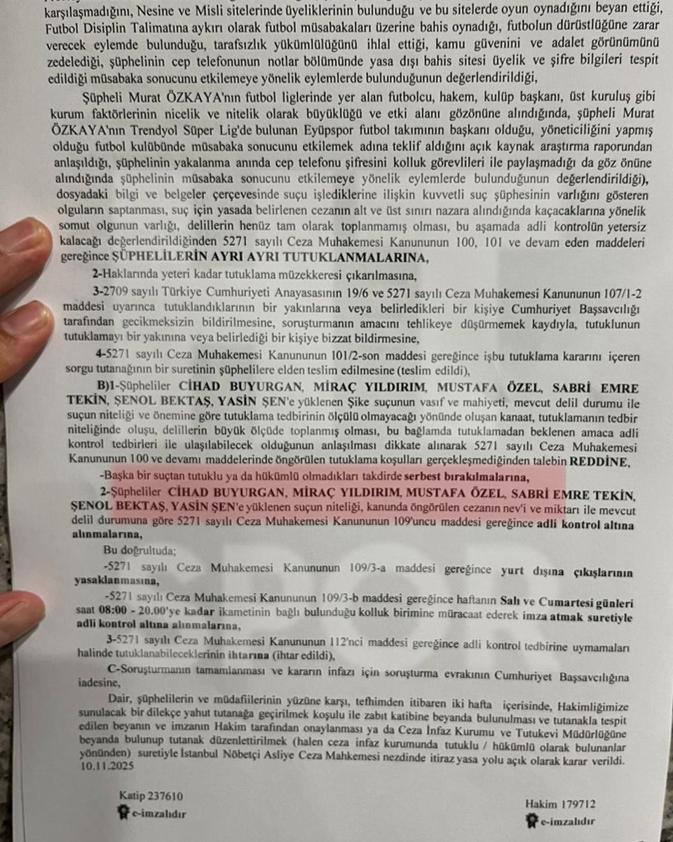 İstanbul 11. Sulh Ceza Hakimliği: "Şüpheli Murat ÖZKAYA’nın futbol ilgililerinden yer alan futbolcu, hakem, kulüp başkanı, üst kuruluş gibi kurum faktörlerinin rüşvet veya nüfuz karşılığı futbolu yönlendirmesinin önüne geçmek amacıyla, şüpheli Murat ÖZKAYA’nın Trendyol Süper Lig’de Eyüpspor futbol takımı başkanı olduğu, yöneticiliğini yapmış olduğu futbol kulübü adına müsabaka sonucunu etkileme teklifi aldığına dair kuvvetli suç şüphesi bulunduğu, bu şüpheyi doğrulayan delillerin bulunduğu, şüphelinin daha önce de aynı kapsamda araştırma dosyasında ifadesine başvurulduğu, şüphelinin müsabaka sonucunu etkilemeye yönelik eylemlerde bulunduğuna yönelik beyan ve belgelerin bulunduğu, dosya kapsamındaki mevcut delil durumu itibariyle şüphelinin kaçma şüphesinin bulunduğu, şüphelinin eylemlerinin suç vasfı itibariyle adli kontrolün yetersiz kalacağı, şüphelinin delilleri karartma veya gizleme olasılığının olması nedeniyle tutuklanmasına karar verilmesi talep edilmiş, yapılan sorgusunda suçlamayı kabul etmediği görülmüştür.