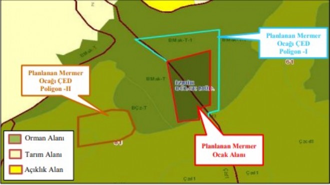 Proje konusu mermer ocağı kapsamında talep edilen ÇED Alanı Poligon -I ve ÇED Alanı Poligon -II, İzmir-Manisa Planlama Bölgesi 1/100.000 ölçekli Çevre Düzeni Planında "Orman Alanı" olarak belirlenen bölgede yer alıyor.