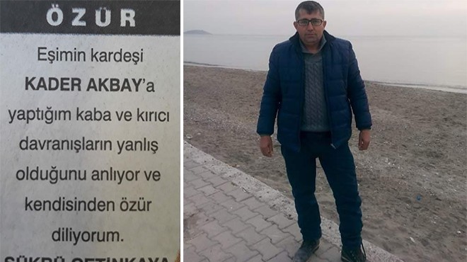 Kader Akbay, bir süre önce kendisini darbettiğini belirttiği, bahçıvanlık yapan diyaliz hastası eniştesi Şükrü Çetinkaya hakkında suç duyurusunda bulundu. Olay, Uzlaştırma Bürosu'na devredildi. Buradaki görüşmeler sonucunda baldız Akbay, Çetinkaya'yı, bir gazeteye ilan vererek kendisinden özür dilemesi halinde affedeceğini söyledi.