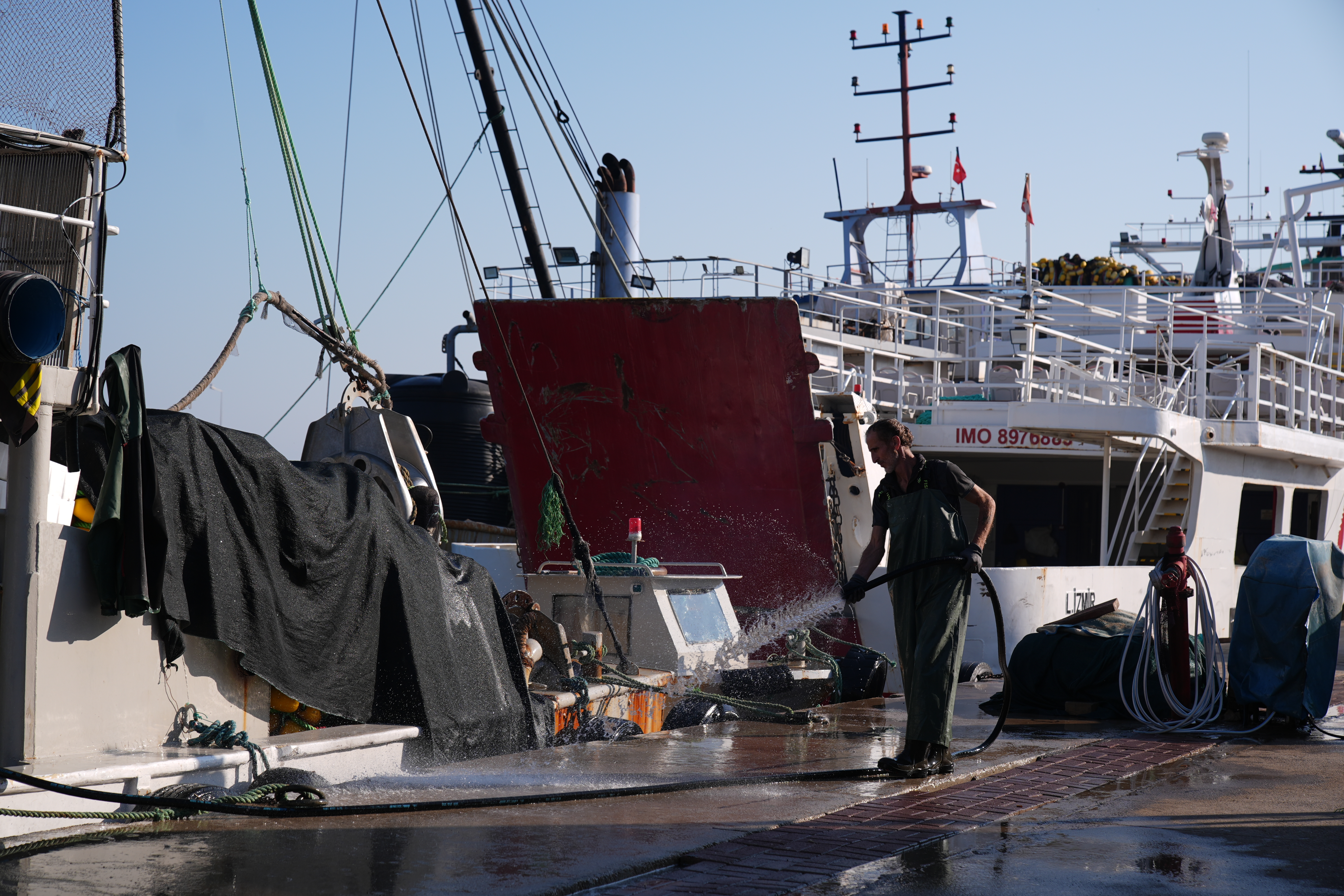 Gemileri temizleyip bakımını yapan ve ağları bir sonraki av için hazırlayan tayfa, uzun süren mesainin ardından geride kalan zamanları çoğunlukla dinlenerek geçiriyor.