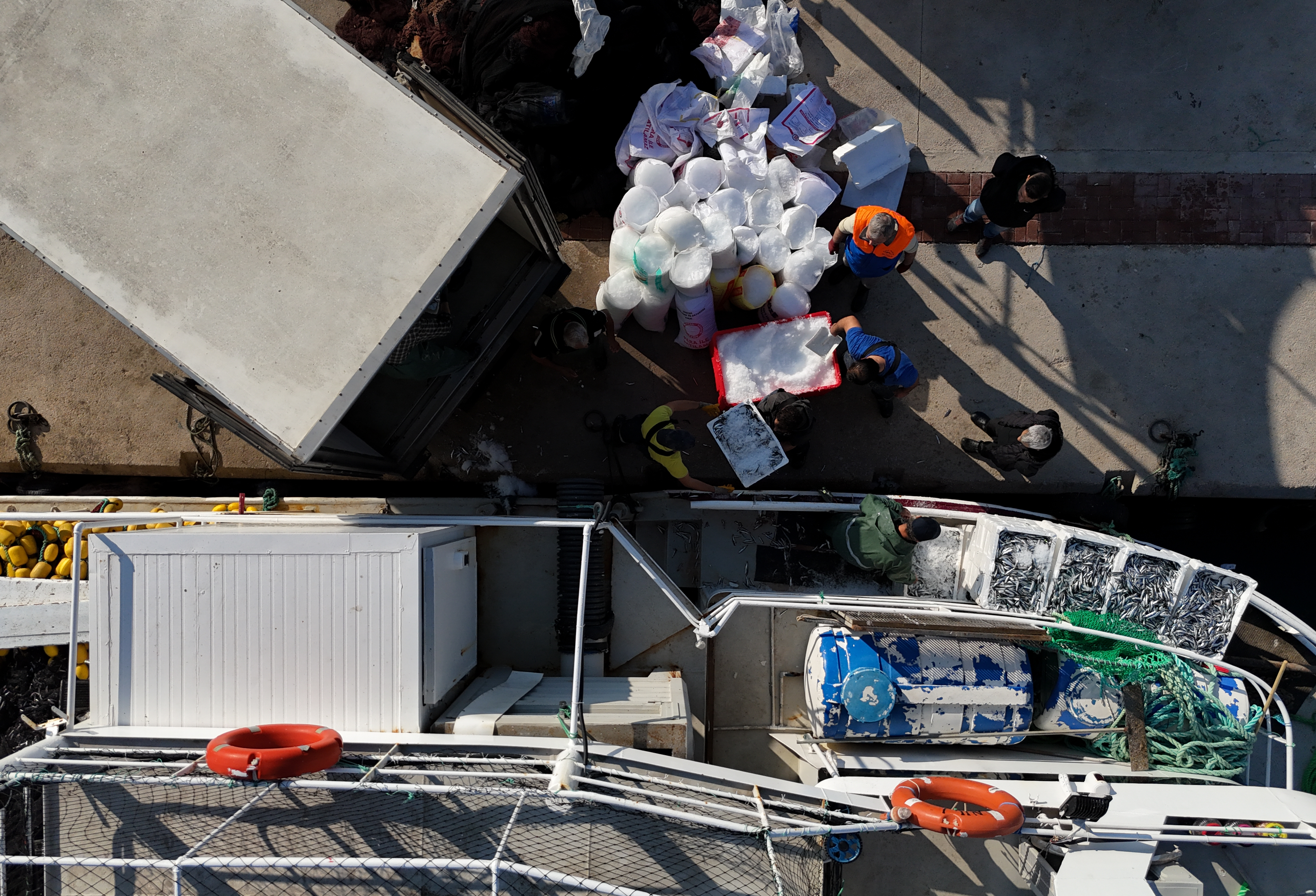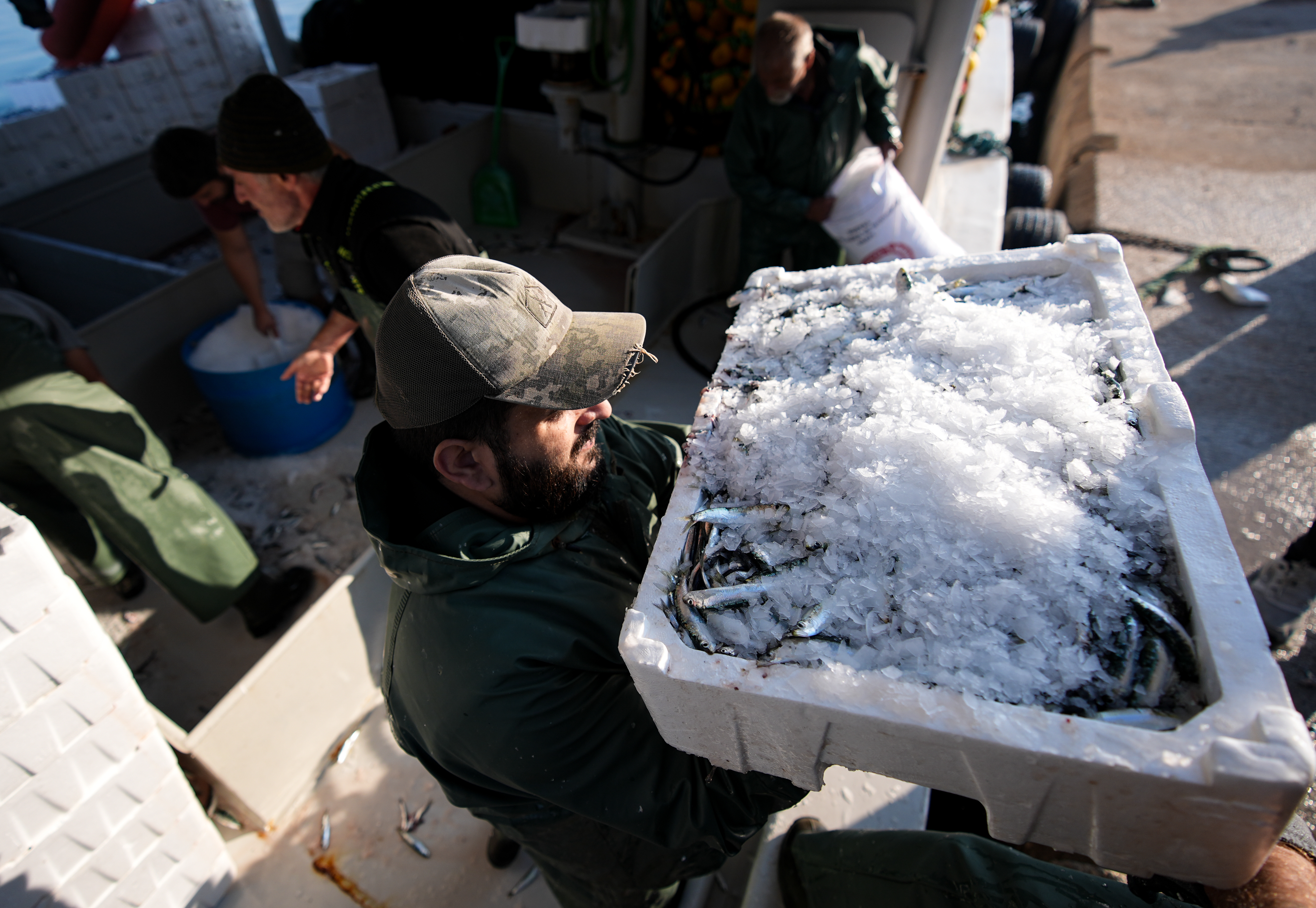Taşımacılığa kıyasla daha ağır bir mesai sürdüren balıkçı tayfası, akşam saatlerinde denize açılan av gemilerinde işe koyuluyor. Ağları denize seren işçiler, takibini yaptıkları balığın teknelere alınmasını, ayrıştırmasını ve kıyıda kamyonlara taşınmasını yapıyor.