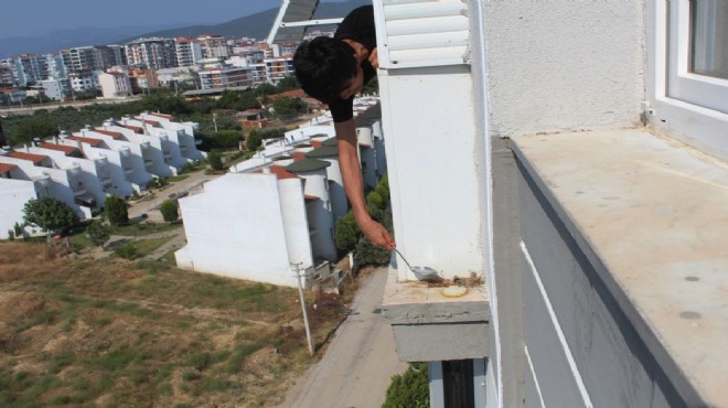 Torbalı Mahallesi Fulya 2 Sitesi'ndeki bir apartmanın 8'inci katındaki balkonun kenarına bir kumru yuva yapıp, 2 yumurta bıraktı. Evlerinin balkonundaki yumurtaların üzerinde yatan kumruyu geçen hafta fark eden lise öğrencisi Emre Topal, bir süre izledi. Anne kumrunun sıcak havada güç şartlarda bulduğu yiyecekler ile yavrularını beslemeye çalıştığını fark eden Topal, ilk iş olarak yuvanın yakınına kavanoz kapağı bıraktı. Ardından da kepçe yardımı ile kavanoz kapağına su koyarak, anne ve yavru kumruların su ihtiyacını çözdü. Ayrıca, yuvanın yakınına ekmek parçaları bırakıp, beslenmelerini sağladı.