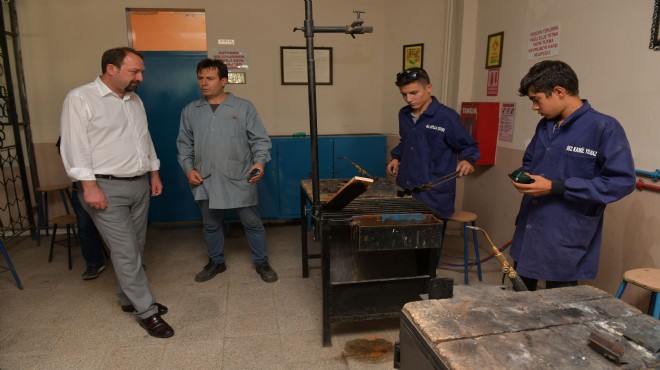 Atölyeleri gezen ve öğrencilerle sohbet eden Başkan Gümrükçü, belediyenin ihtiyaç duyacağı mobilya, bank ve çöp konteynerlerini okulun üretmesini ve tamir etmesini önerdi ve “Bazı ürünleri geri dönüşüm malzemeleri kullanarak üretelim. Bu üretim sayesinde hem öğrencilerimize maddi destek sağlayalım hem de dönüşüm ekonomisine katkı sağlayarak çevreyi koruyalım” dedi.