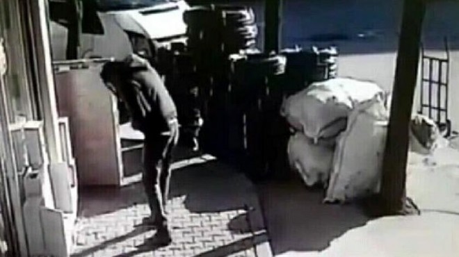 Öte yandan, olay, yapı marketin güvenlik kamerasına yansıdı. Görüntülerde, İzzet Demir ve arkadaşının iş yerinin önünde beklediği, aniden düşen cam parçasıyla şok yaşayıp kaçıştıkları ve Demir'in başını eliyle kontrol ettiği görülüyor. (DHA)