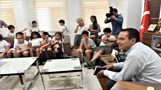 Öğrencileri makamında ağırlayan Bornova Belediye Başkanı Olgun Atila da miniklerle sohbet etti.