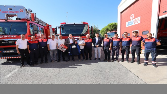 İzmir Büyükşehir Belediyesi İtfaiye Daire Başkanı Yaşar Korkmaz ve Yangın ve Acil Müdahale Şube Müdürü Aydın Mutlu, kahvaltı etkinliğinin ardından Urla Belediye Başkanı Selçuk Balkan’a gönüllü ekipmanları hediye etti