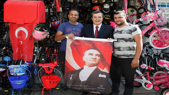 Konak Belediye Başkanı Abdül Batur, Konak’ta esnafın en yoğun bölgelerden biri olan Çankaya ve Alsancak bölgesindeki esnafa, 29 Ekim öncesinde anlamlı bir hediye verdi. Cumhuriyetimizin kurucusu Ulu Önder Mustafa Kemal Atatürk ve silah arkadaşlarına minnet duygusuyla, Atatürk baskılı, ‘Bu vatan bizim, Cumhuriyet hepimizin’ yazılı posteri alan esnaf ise büyük bir gurur ile dükkânlarına asacaklarını belirttiler.