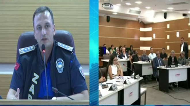 Bornova’daki meclis toplantısında ilgili kurumlardan alınan ‘borcu yoktur’ yazısı ekrana yansıtıldı.