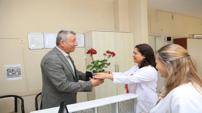 Güzelbahçe’de bulunan sağlık ocağı ve Polikliniği’ni gezen Güzelbahçe Belediye Başkanı Mustafa Günay, hemşirelerin günün kutladı birer sardunya çiçeği hediye etti.