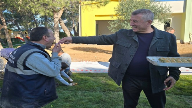Başkan Günay, Güzelbahçe Belediyesi Park Bahçeler, Fen İşleri ve Temizlik İşleri personelini sahada ziyaret ederek projelerin hızla gerçekleşmesi için canla başla çalışan işçilere tek tek teşekkür ederek elleriyle baklava ikram etti.