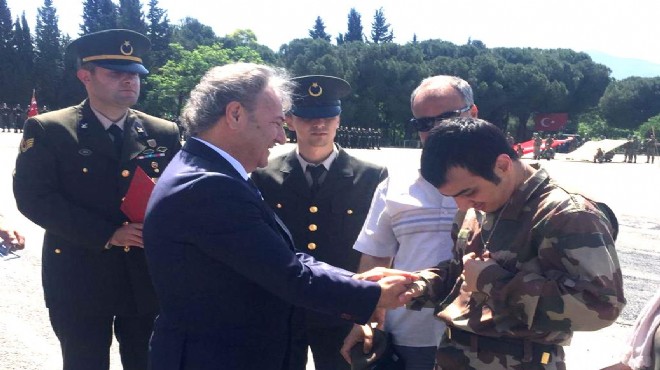 Bornova Belediye Başkanı Dr. Mustafa İduğ, İzmir 57. Topçu Tugay Komutanlığı'nda bir günlük temsili eğitim alan 43 engelli için düzenlenen törene katıldı. Başkan İduğ, askeri kamuflajlarını giyip ant içerek terhis olmanın sevincini yaşayan engelli askerlerin künyelerini Bornova Kaymakamı Fatih Genel ve Tuğgeneral Sebahattin Türker ile birlikte taktı.