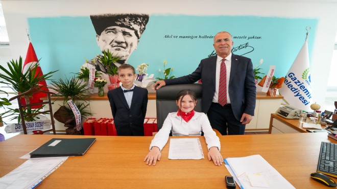 Gaziemir Belediye Başkanı Ünal Işık, 23 Nisan Ulusal Egemenlik ve Çocuk Bayramı nedeniyle koltuğunu üç öğrenciye bıraktı. İlkokul 4. sınıf öğrencileri Alya Su Gücün, Ahmet Deniz Faraş ve Aybars Tuna Kurnaz sırayla belediye başkanlığı koltuğuna oturdu.
