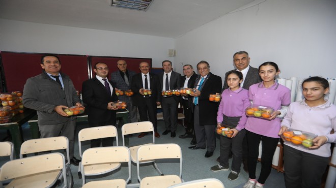 Törenin ardından Buca Kaymakamı Fecri Fikret Çelik, Buca Belediye Başkanı Levent Piriştina ve İZKOMDER Başkanı Orhan Doğan öğrencilere meyve dağıttı.
