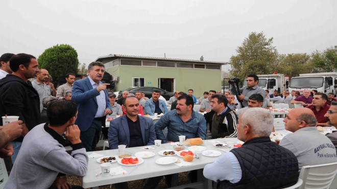 Bayraklı Belediye Başkanı Serdar Sandal, mesai öncesi Park ve Bahçeler Müdürlüğü'nde görevli personel ve Disk Genel İş 6 No'lu Şube üyeleriyle kahvaltıda buluştu. Kenti başka bir noktaya taşımak istediklerini, bunun içinde çalışanlara güveninin tam olduğunu vurgulayan Başkan Sandal, "Bunun için iradeyi ortaya doğru koymak lazım. Bu iradeyi de sonuna kadar ortaya koyacağız. Bayraklı Belediyesi dendiğinde insanların aklına liyakat esasına göre iş yapıldığı, kimsenin kayrılmadığı, herkesin eşit olduğu, kimseye pozitif ayrımcılığın yapılmadığı bir çalışma ortamının gelmesini istiyoruz. Bir arkadaşımız A birimde 5 lira alıyorsa, B birimindeki aynı işi yapan arkadaşım da aynı ücreti alacak. Hangi siyasal partiye oy verdiğinin hiçbir önemi yok. Ben emekçinin işine ve alın terine bakarım. O nedenle rahat olun. Kimin ne dediğinin bir önemi yok. Adam olanın söz ağzından çıkar. Biz aday adayıyken bir söz söyledik, ‘kimseyi işinden etmeyeceğiz’ dedik. Kimsenin işine son vermedik. Gece gündüz aklımızla vicdanımızla işimizin başındayız" dedi.