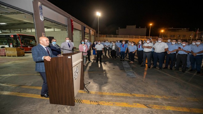 İzmir Büyükşehir Belediyesi Genel Sekreteri Dr. Buğra Gökçe ile sabah saat 05.00'te ESHOT'un Buca Adatepe Garajı'na gelen Başkan Tunç Soyer'i burada ESHOT Genel Müdürü Erhan Bey ve DİSK Ege Bölge Temsilcisi Memiş Sarı'nın yanı sıra göreve hazırlanan şoförler karşıladı. Sefere çıkacak şoförlerle tek tek bayramlaşan Soyer, ESHOT'un kuruluşunun 77. yılının olduğunu anımsatarak, “Demek ki kurumlar kalıyor, bizler yolcuyuz. Geçiyoruz. Bu süre içerisinde de adeta nöbet tutuyoruz. Bu kadar köklü bir kurumun parçası olmak hepimiz için onur verici. Gurur verici” dedi. Konuşmasında çocukluk anılarına da değinen Tunç Soyer, şunları söyledi: “8-10 yaşlarındayken otobüs şoförü olmayı çok istiyordum. Hayattaki en büyük idealim oydu. Kısmet, ben olamadım ama bugün sizlerle bunu paylaşma fırsatı buldum.”