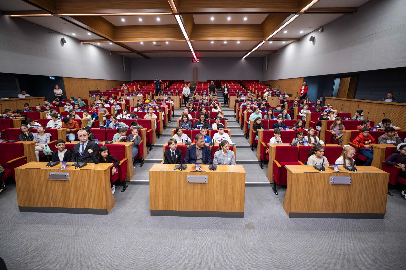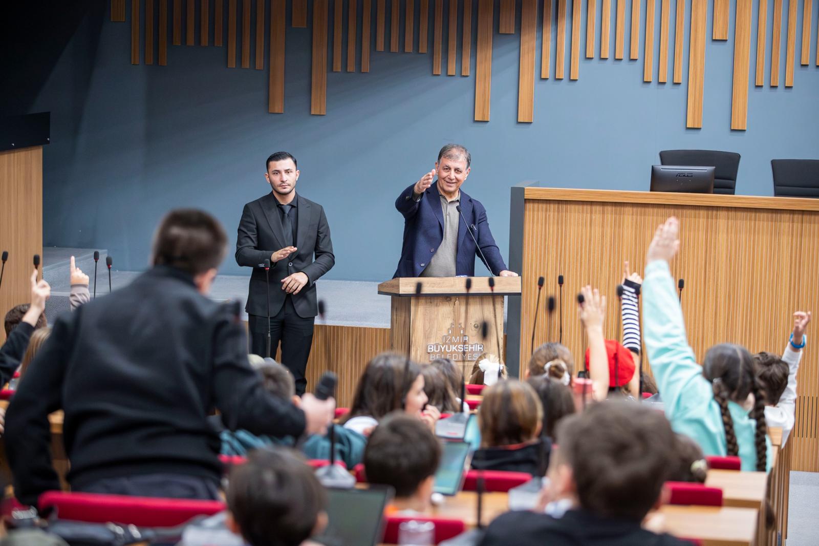 Çocukları dinledikten sonra kürsüye gelen Başkan Tugay, “Sabırsızlıkla bugünü bekliyordum. Sizlerin neler söyleyeceğini çok merak ediyorum. Sizler her biriniz birer bireysiniz. Çocuk olmanız fark etmiyor. Dünyadaki bütün insanlar çocuktu ve sonra büyüdüler. Siz de büyüyeceksiniz. Sizler her biriniz özelsiniz. Çok iyi bir yaşamı hak ediyorsunuz. Güzel bir yaşam yaşamanız gerekiyor. Başkalarına sorumluluk düşüyor ama size de görev düşüyor. Önce kendinize, sonra sevdiklerinize, ailenize, arkadaşlarınıza, okulunuza, mahallenize, şehrinize, ülkenize ve dünyaya sahip çıkmanız gerekiyor. Bunların hepsi size ait. Önümüzdeki aylarda, yıllarda, dünya güzel olsun, her şeyi iyi olsun istiyorsanız, bazı şeyler için şimdiden üzerinize düşeni yapmalısınız. Sizler bu şehirdeki çocukları temsil edenlersiniz. Onlar adına burada konuşuyorsunuz, ben de İzmir Büyükşehir Belediye Başkanı olarak sizleri dinlemek istiyorum” dedi.