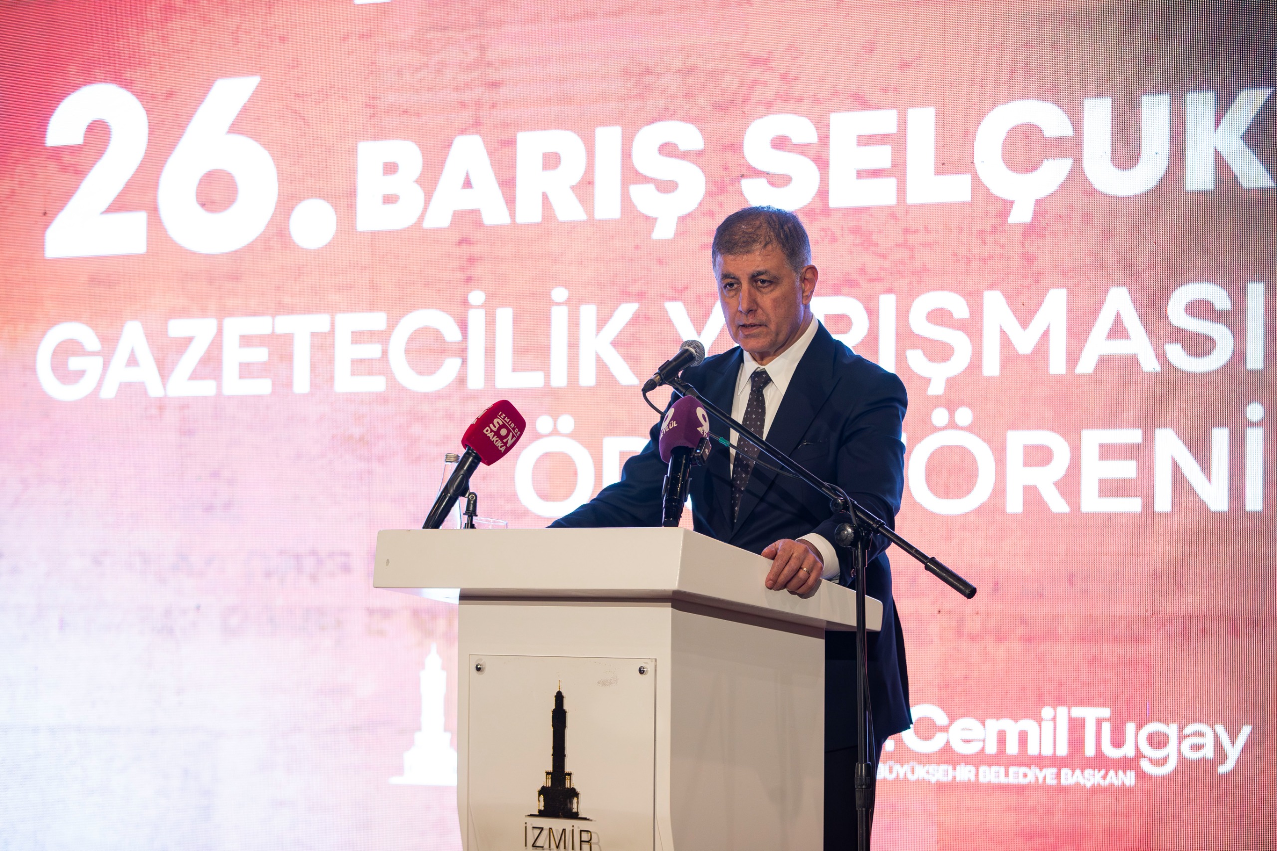 Törenin açılış konuşmasını yapan Başkan Dr. Cemil Tugay, sözlerine yaşamını yitiren Barış Selçuk ve Hande Mumcu’yu anarak başladı. Gazetecilerin Türkiye’de ciddi baskılar altında mücadele verdiğini söyleyen Başkan Tugay, “2025 yılı Basın Özgürlüğü Raporu’na göre; gazeteciler son bir yıl içinde 610 kez mahkeme salonlarında yargılandı. 95 gazeteci gözaltına alındı, 39’u tutuklandı. RTÜK tarafından dört televizyon kanalına toplam 92,7 milyon lira idari para cezası kesildi. Uluslararası Sınır Tanımayan Gazeteciler Örgütü’nün yayımladığı Basın Özgürlüğü Endeksi’nde ise Türkiye, 180 ülke arasında 159’uncu sırada yer aldı. Gazeteciler arasında işsizlik oranı yüzde 20’nin üzerinde. Bütün bu tabloya rağmen şunu büyük bir inançla söylüyorum; bu ülkede gazetecilik hâlâ yaşıyor. Çünkü arkadan gelen genç gazetecilerimiz, filizlerimiz var. Gerçeğin peşinden gitmekten vazgeçmeyen insanlar var” diye konuştu.