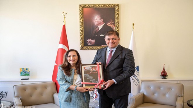 Kuzey Kıbrıs Türk Cumhuriyeti’nin (KKTC) İzmir Başkonsolosu Ayşen Volkan İnanıroğlu, İzmir Büyükşehir Belediye Başkanı Dr. Cemil Tugay’ı makamında ziyaret etti. 20 Temmuz’da KKTC’nin Barış ve Özgürlük Bayramı’nın 50. yıl dönümünü kutlayacaklarını söyleyen Başkonsolos Ayşen Volkan İnanıroğlu, “Gazilerimizi, şehitlerimizi minnet ve şükranla anıyoruz. Onlar olmasa biz burada olmazdık. Onların sayesinde bugünlere kavuştuk. İzmir ve Kıbrıs’ın çok fazla ortak yönü var. Birlikte çok güzel işler yapacağımıza inanıyorum” dedi.