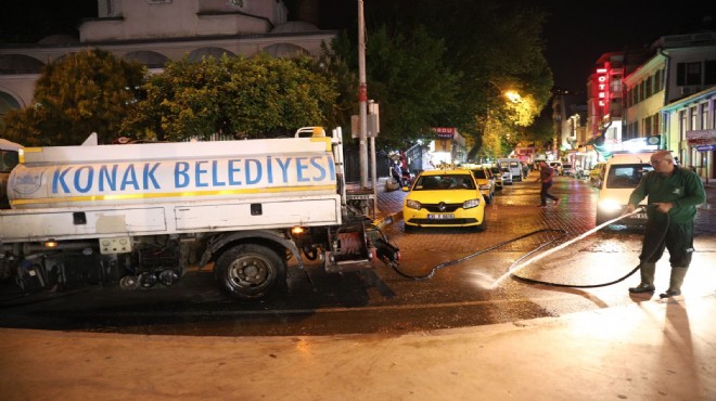 Gündüz saatlerinde yaya ve araç trafiğinin en yoğun işlediği bölgelerden olan Basmane’de özellikle de Anafartalar Caddesi üzerindeki çalışmalar gece saatlerinde gerçekleştirildi. Konak Belediyesi’nin Temizlik İşleri Müdürlüğüne bağlı ekipler tarafından gece mesaisi kapsamında, tüm cadde boydan boya süpürüldü ve yıkandı. Bölgedeki çöp konteynırları deterjanlı sularla yıkanarak dezenfekte edildi. Çöp toplama işlemlerinin yanı sıra görüntü kirliliği yaratan ve halk sağlığını tehdit eden molozlar da kaldırıldı.