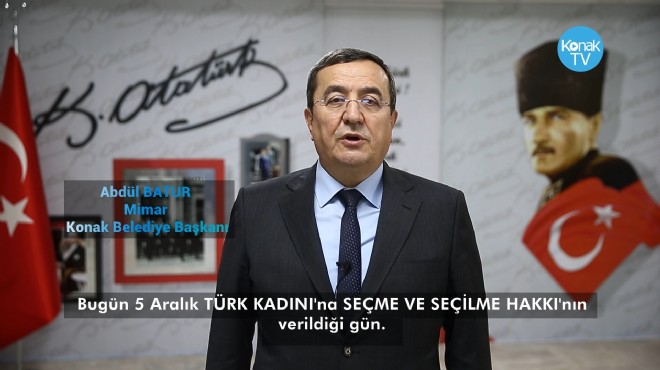 Konak Belediye Başkanı Abdül Batur, Türkiye'de kadınlara seçme ve seçilme hakkının tanınmasının 86’ncı yıldönümünü yayınladığı mesaj ile kutladı. Mesajında Türk kadınının, seçme seçilme hakkına birçok devletten önce sahip olduğuna dikkat çeken Başkan Batur, Konak’ta kadın dostu bir belediye hedeflediklerinin altını çizdi. “Güçlü kadın olmazsa, güçlü toplum olmaz” sözleri ile kadının hayatın her alanında güçlenmesini desteklediklerini vurgulayan ve bu amaca yönelik olarak sivil toplum kuruluşları ile birlikte kadını destekleyen projeleri hayata geçirdiklerini dile getiren Başkan Batur’un mesajında şu ifadeler yer aldı: