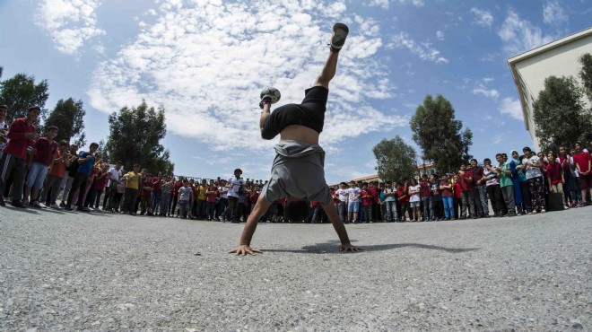 Bayraklı'daki 29 farklı okulda düzenlenen etkinliklerde öğrenciler ders arasında çalan zilin ardından kendilerini okul bahçesinde yapılan gösterilerin içinde buldu. Önce şaşkınlığını gizleyemeyen öğrenciler daha sonra serbest futbol, basketbol, dans ve çeşitli akrobasi şovlarında yapılan birbirinden zorlu hareketleri izlemenin keyfini yaşadı.