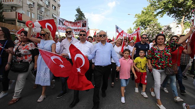 Etkinlikte konuşan Bayraklı Belediye Başkanı Hasan Karabağ, “Kurtuluş savaşı vermiş bir coğrafyanın insanlarıyız. Bizim bir özelliğimiz var; işsiz kalırız, aç kalırız, kıyafetsiz yaşayabiliriz ama vatansız asla! Bizi bölmek isteyenlere, ülkemizi Arap cumhuriyetine çevirmek isteyenlere asla fırsat vermeyeceğiz. Korkaklar her gün ölür cesurlar bir gün. Sığınacağımız tek liman Mustafa Kemal Atatürk’tür” dedi.
