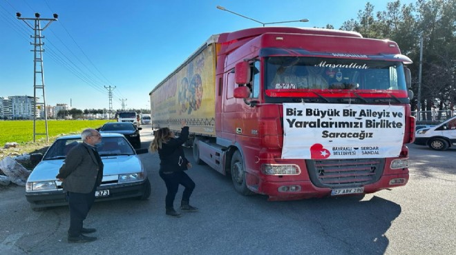 Depremden etkilenen 10 ilde yürütülen çalışmalara Türkiye’nin her yerinden destekler çığ gibi büyürken Bayraklı’da da yardım seferberliği sürüyor. Depremin olduğu ilk günden itibaren ilçe genelindeki gönüllülerin de destekleriyle gece gündüz yardım toplayan ekipler, yüzbinlerce temel ihtiyaç malzemesini deprem bölgelerine ulaştırdı. 10’un üzerinde tır, toplanan yardımları karayoluyla afet bölgesine taşırken, İzmir Büyükşehir Belediyesi ile işbirliği halinde deniz ve hava ulaşımıyla da on binlerce yardım malzemesi bölgeye gönderildi. Başta çadır, konteyner ve uyku tulumu olmak üzere, ısıtıcı, battaniye, bebek bezi, mama, su, hijyen malzemeleri ve gıda ürünlerinin toplanarak depremzedelere ulaştırılmaya devam edileceği belirtildi.
