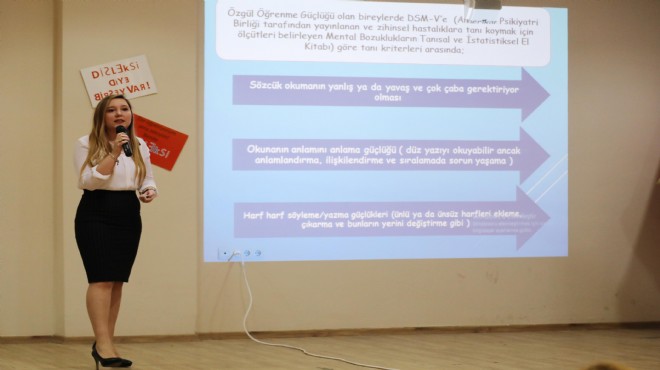Postacılar İsmet İnönü Kültür Merkezi’nde düzenlenen etkinliğe Bayraklı Belediyesi Sosyal Etkinlik Merkezi (BAYSEM) öğretmenleri, meclis üyeleri ve vatandaşlar katıldı. Özel İzmir Dost Psikoloji Aile Danışma Merkezi Kurucu Müdürü Uzman Psikolojik Danışman Begüm Ayyıldız, disleksi hakkında katılımcılara bilgi verdi.