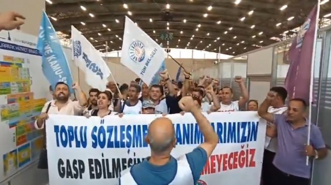 İzmir Büyükşehir Belediyesi’nin Kültürpark’ta hizmet binası olarak kullandığı hollerde yürüyen memurlar alkışlar ve ıslıklarla protesto ederek ‘Bize ekmek yoksa size huzur yok’ sloganları attı.