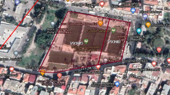 İşte o önerge: 1/1000 ölçekli Mer’i imar planında kısmen Semt Spor Alanı, kısmende park alanında kalan ve üzerinde hazlihazırda Bucaspor Kulubü Derneğinin halı sahalarının bulunduğu 7142 ada 4 ve 5 parsellerden 11208,00m² yüzölçümlü 4 parseldeki Belediyemize ait 800,23m²’lik hissemizin 5393 sayılı Belediye Kanununun 75. Maddesinin (d) bendinde belirtildiği şekliyle 25 yıl süre ile ücretsiz olarak Gençlik ve Spor İl Müdürlüğüne tahsis edilmesi istemine dair önerge.