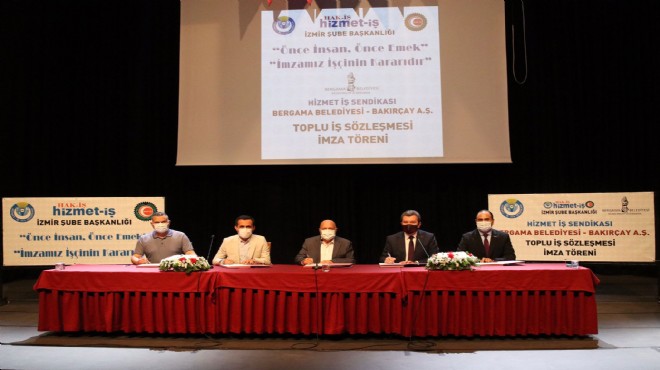Bergama Kültür Merkezi’nde düzenlenen imza törenine Bergama Belediye Başkanı Hakan Koştu, Hak-İş Konfederasyonu Genel Başkanı Mahmut Arslan, Hizmet-İş Sendikası İzmir Şube Başkanı Gültekin Şimşek, Belediye Başkan Yardımcıları Cüneyt Umutlu, Aşkın Uyar ve işçiler katıldı.