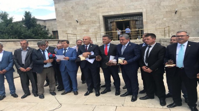 İzmir-Bergama Kozak Yaylası Muhtarları adına söz alan Yusuf Doğan “Bizler, İzmir’in Bergama ilçesinin Kozak Yaylası muhtarları olarak, yaklaşık 600 kilometre öteden, bölgemizin en önemli gelir kaynağı olan çam fıstığının, 10 yıldan bu yana giderek düşen verimliliğine çare bulmak ve bu konuda sesimizi duyurabilmek için buradayız. Son 10 yıldan bu yana çam fıstığı veriminde yöre halkının geçim sıkıntısı yaşamasına neden olacak düzeyde bir verim düşüşü yaşanmıştır. Bunun sonucunda göçler yaşanmış, bölge de çalışan gençlerimiz başka yörelere göç etmek zorunda kalmıştır. Kozak Yaylası’nda çam fıstığı üretimi, 10 yıl öncesinde yaklaşık 60 milyon dolar ihracat rakamlarına ulaşırken, bugün bu rakamın sadece %10’u kadar ihracat yapılmaktadır. Bu rakam şuanda sadece maliyet giderlerini karşılamaktadır. Verim düşüşü ile ilgili bazı tahminler ve araştırmalar mevcuttur. Bizler, bölgede çam fıstığından geçimini sağlayan yaklaşık 10 bin kişinin sözcüsü olarak; siz değerli yetkililerden, milletvekillimiz tarafından Meclis’e sunulduğu üzere, çam fıstığındaki rekolte düşüşüne dair çözüm odaklı araştırmaların yapılmasını sağlayacak bir “Çam Fıstığı Araştırma ve Koruma Enstitüsü” kurulmasını talep ediyoruz. Kozak Yaylasının zenginliği ülkemizin zenginliğidir. Kozak’ın eski günlerine dönmesi ve çam fıstığının eski hak ettiği değeri bulması için talep ve isteklerimizi gözden geçireceğinizi umuyor, çalışmalarınızda kolaylıklar diliyoruz.” dedi.