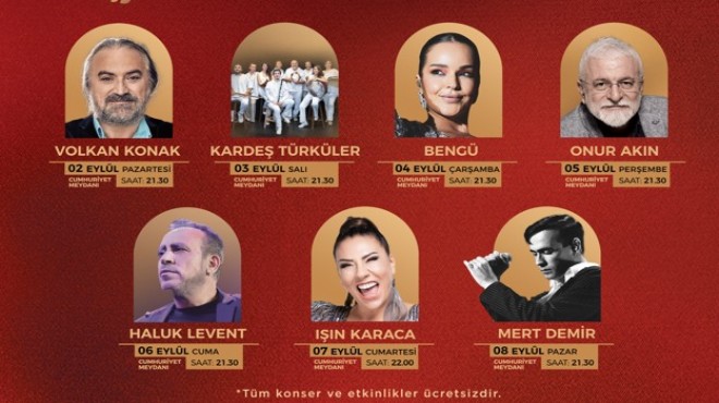 2 Eylül Pazartesi Cumhuriyet Meydanı’nda Volkan KONAK konseri ile başlayacak konserlerde, 3 Eylül Salı Kardeş Türküler, 4 Eylül Çarşamba Bengü, 5 Eylül Perşembe Onur AKIN, 6 Eylül Cuma Haluk LEVENT, 7 Eylül Cumartesi Işın KARACA ve 8 Eylül Pazar günü Mert DEMİR sahne alacaklar.
