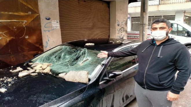 Konak ilçesi Güneşli Mahallesi 515 Sokak'ta alt katında dükkan olan 2 katlı atıl binadan, gece yarısı etkili olan fırtına nedeniyle kopan beton parçaları, Halit Sincar'a (34) ait park halindeki 06 BZF 064 plakalı otomobilin üzerine düştü.