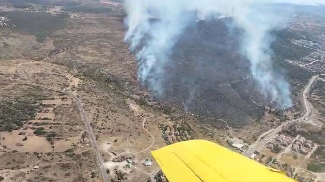 İzmir'in Çeşme ilçesinde makilik alanda çıkan yangın, havadan ve karadan müdahaleyle kontrol altına alınmaya çalışılıyor.