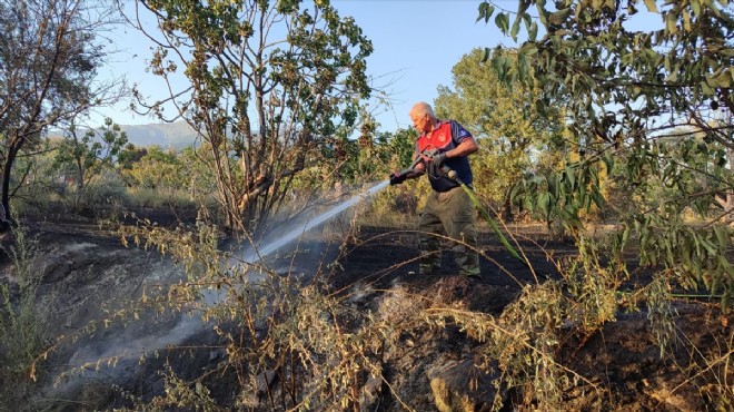 Alınan bilgiye göre, Birgi Mahallesi İrimağzı mevkisindeki zeytin ve incir ağaçlarının bulunduğu bahçede, henüz bilinmeyen nedenle yangın çıktı.