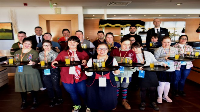 Bornova Belediyesi’nin Hilton Otelleri’yle birlikte Down Sendromlu gençlerin meslek sahibi olarak sosyal yaşamın içerisinde yer alması amacıyla hayata geçirdiği “İş’te Fark Yaratıyoruz” projesi, Uygulamalı Servis Eğitim ile devam ediyor. 18 Down Sendromlu genç peçete katlamayı, servis açmayı, tepsi ile içecek taşımayı ve boş servisleri toplamayı öğreniyor. O anlardaki mutlulukları ise yüzlerinden okunuyor.