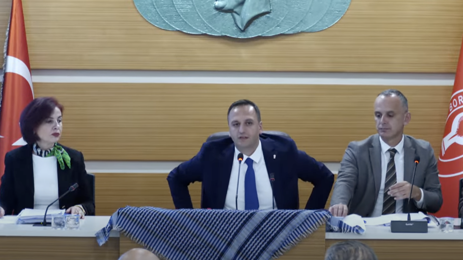 Toplantı başlamadan önce Gazze’de yaşanan katliama dikkat çeken Başkan Eşki, meclis kürsüsüne poşu astı. Eşki, “Yaser Arafat büyük bir önderdi. Bugün hem Filistin’de katledilenler hem de El Arafat’ın mücadelesi için kürsüye poşu asıyorum” dedi.