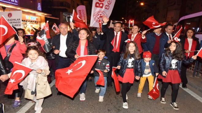 Akşam ise Fener Alayı yürüyüşünde Mustafa Kemal Caddesi Türk Bayrakları, Atatürk posterleri ve meşalelerle adeta kırmızıya boyandı. Çevre yolu viyadüklerinin altından başlayan yürüyüş kadın-erkek, genç-yaşlı binlerce Bornovalının katılımıyla gerçekleşti. Bornova Belediye Başkanı Olgun Atila, kortejde ailesi birlikte yer aldı. CHP Bornova İlçe Başkanı Nevzat Kavaları’n da yerine aldığı yürüyüşte, marşlar hep bir ağızdan söylenirken ev ve işlerlerinden korteji selamlayanlar da Cumhuriyet coşkusuna katıldı.