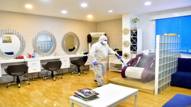 İlçe genelinde hastane ve aile sağlığı merkezi gibi sağlık kuruluşlarının yanı sıra taksi ve dolmuş gibi vatandaşın ortak kullandığı alanları da dezenfekte eden Bornova Belediyesi’nin uzman ekipleri, esnaftan gelen talepler doğrultusunda ilçedeki berber, kuaför ve güzellik salonlarında temizlik ve ilaçlama yapıyor.