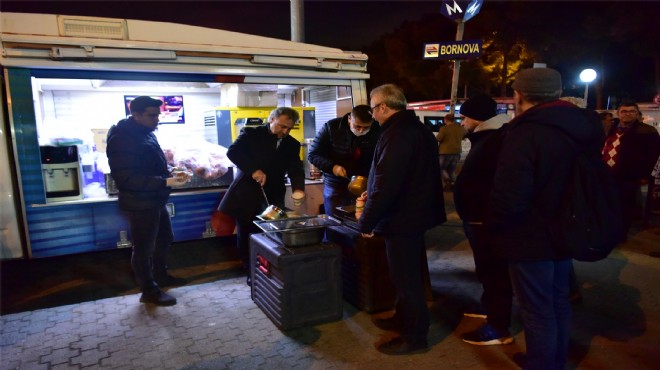İzmir Metrosu’nun Bornova istasyonundaki çorba ikramına Bornova Belediye Başkanı Dr. Mustafa İduğ da katıldı. Vatandaşlarla birlikte sıraya girip çorbasını alan, sonra da kazanın başına geçip vatandaşlara ikram eden Başkan İduğ, “Herkesi soğuk havalarda verdiğimiz bu hizmetten yararlanmaya bekliyoruz” dedi.