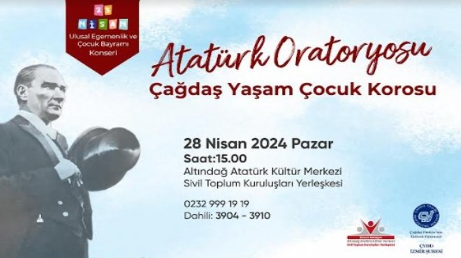 Çağdaş Yaşamı Destekleme Derneği (ÇYDD) İzmir Şubesi’nin kurduğu Çağdaş Yaşam Çocuk Korosu ve Bornova Belediyesi işbirliğiyle gerçekleştirilecek Atatürk Oratoryosu, 28 Nisan Pazartesi günü saat 15.00’te Altındağ Atatürk Kültür Merkezi Sivil Toplum Kuruluşları Yerleşkesi’nde sahnelenecek. Çağdaş Yaşam Çocuk Korosu üyesi 50 çocuk, Mustafa Kemal Atatürk'ün hayatını müzik ve şiirler aracılığıyla anlatacak.