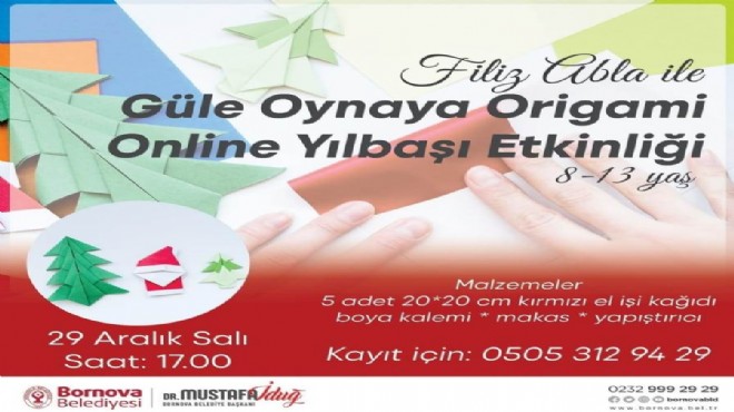 Koronavirüs salgını sürecinde pek çok hizmet, eğitim ve kursu sosyal medya hesapları aracılığıyla yürüten Bornova Bornova Belediyesi, yeni yıl öncesinde çocuklar için on-line origami etkinliği düzenleyecek. 8-13 yaş arası çocuklar “Güle Oynaya Origami” adlı etkinlikte eğlenceli saatler geçirecek. 29 Aralık Salı günü saat 17.00’de gerçekleştirilecek etkinliğe katılmak isteyen çocukların 0505 312 94 29 numaralı telefona kayıt yaptırması gerekiyor. Kaydı alınan çocuklar kendilerine gönderilecek zoom linki üzerinden Eğitmen Filiz Özyurt’un eşliğinde kesme ve yapıştırma işlemi yapmadan tek parça kağıdı katlayarak çeşitli figürler ve yılbaşı süsleri yapmayı öğrenecek.