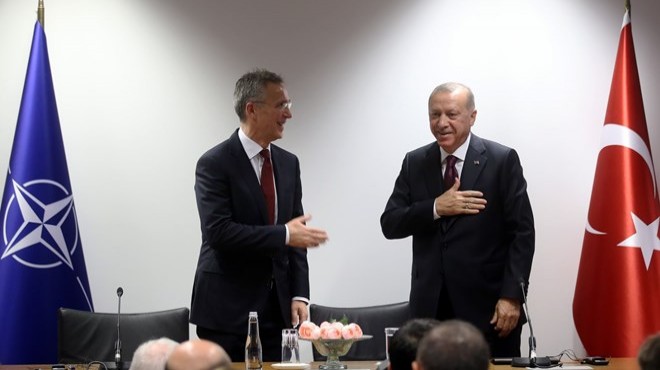 Toplantının sonunda Cumhurbaşkanı Erdoğan'ın, tokalaşma yerine elini göğsüne götürerek "Corona" demesi üzerine Stoltenberg de elini göğsüne götürerek karşılık verdi. (AA)