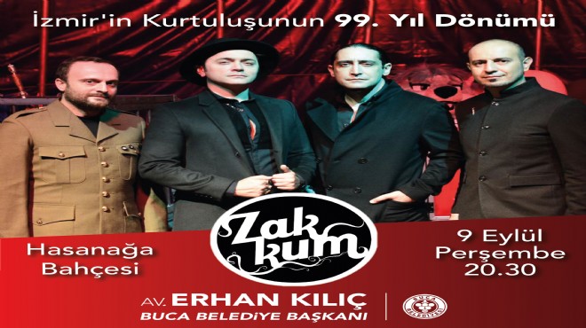 Buca Belediyesi, 9 Eylül İzmir’in kurtuluşunun 99. yıl dönümü nedeniyle, kutlama programı düzenledi. Program kapsamında sevilen müzik grubu Zakkum, Hasanağa Bahçesi’nde saat 20.30’da konser verecek. Ünlü grup konserde en sevilen şarkılarını İzmirliler için seslendirecek.